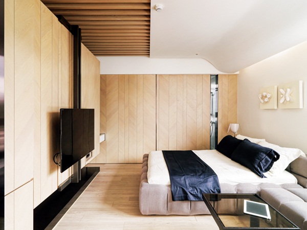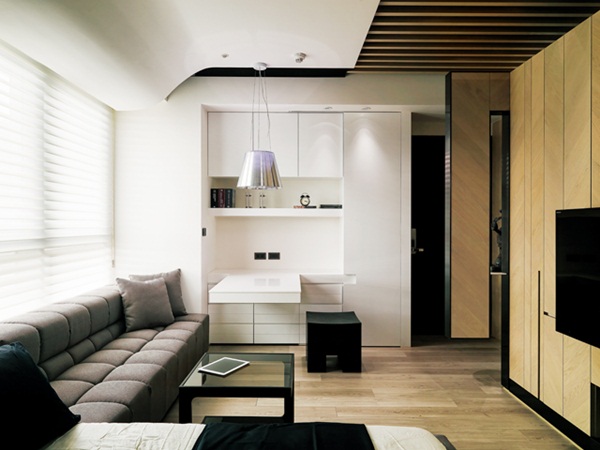 小坪數空間是最能體現空間趣味的設計類型之一。空間雖小,然而設備機能卻一樣不能少,而且更需要顯現自在、舒暢的動線。在這個有限的 8 坪空間裡,需要整合多元的收納,以及完備所有機能性空間。因為衛浴的位置固定,靠窗的位置面向自然光,那麼就順勢做出橫拉門,節省空間開展的幅度,關起時猶如臥房的一面牆,打開時引進大面陽光入室內。整合所有收納也是創意不絕的點子之一,在電視牆的立面統合廚具櫃、衣櫥、視聽櫃及化裝櫃,滿足生活收納的最大使用性,複合式的規劃想法,賦予小坪數空間最大的獨立活用性。