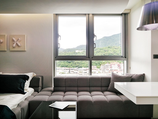 沙發和床架邊框為相似材質形式,串連整體空間感,也隱性區隔出不同空間機能。