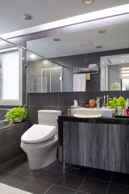 衛浴空間走深灰色系,搭配幾株青綠色植栽,簡單卻依然生意盎然。