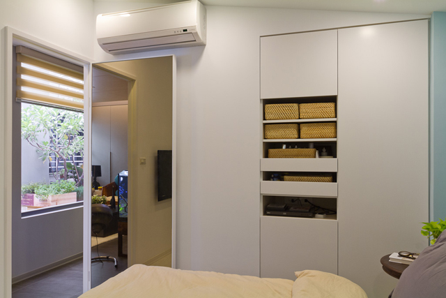 臥房採取簡單設計方式,讓空間回歸單純睡眠機能,不同於公共空間的明亮用色,透過彩度較低的淺藍色,形構清新無壓的舒眠環境。