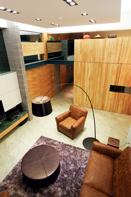 原木色的玄關櫃凹凸錯落門片設計,延伸至客廳白色背牆,營造「森林」的意象,搭配加拿大進口設計款的皮製沙發及圓茶几、長毛毯,為空間添入溫調的「森」呼吸。