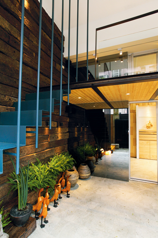 半戶外的前院陽台,透過防潮防水的鐵道枕木、灰鏡打造出明亮休閒的的峇里島休閒風,而鐵件摺紙樓梯串連玻璃扶手空橋,將動線機能輕量化。