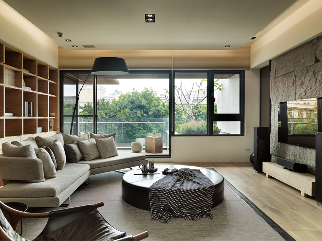 綠意自然,空間更具呼吸感。質樸粗獷的石面電視牆,以及帶有木紋節理的橡木地坪,呼應窗外一方林蔭景觀,讓空間散發悠閒、放鬆氣息。