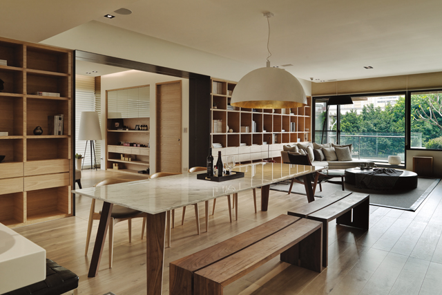 重視家人、親友情感交流的屋主,期望空間中能有一張大桌,作為生活、聚會、活動的核心;而大面書櫃,則可展示收藏與圖書,象徵生命中點點滴滴的累積。