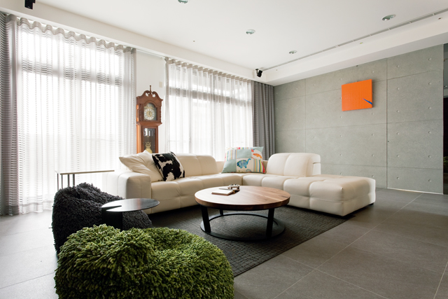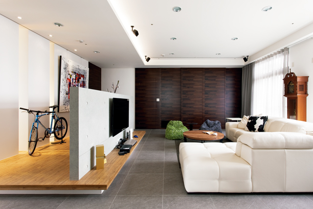 大坪數的居家空間,以一座架高的藝術廊道以及適當材質和傢具配搭,創造自然舒適的空間氛圍。