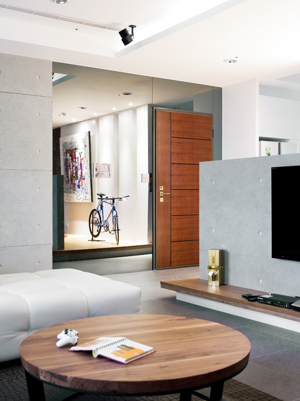 透過大面灰鏡的反射特性,不僅解決入口門片較低的問題,也帶來放大空間效果。