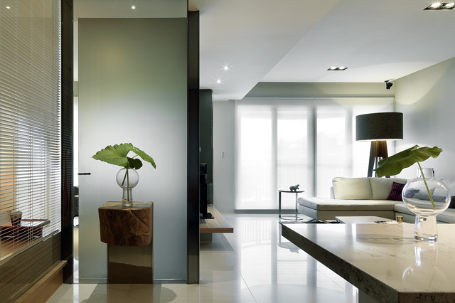 本案是全新電梯大樓住宅,設計師盡量保留原始格局,僅做局部微調,將預算留給材質與傢具,也將採光與戶外綠景,與室內空間做串連處理;在玄關隔屏的處理上,採用蠶絲染棗紅與樹脂膠合的材質,背貼茶玻讓光線穿透,讓視線停留。玄關端景也以茶玻和鍍鈦鐵件營造清透效果,更在茶玻上設計了彷彿從虛空中長出來的實木平台,賦予空間禪境想像,成為一進門的視覺焦點。客廳電視牆以棕色秋海棠石鋪陳,旁邊的吊櫃覆以深色鍍鈦鐵板營造輕盈效果,亂紋表面與石材紋路相映又對比,為低調簡淨的氛圍注入時尚現代。電視牆不做滿,上方與書房之間,用清玻璃區隔,透過百葉的調整與拉起,空間的關係也隨之變化。