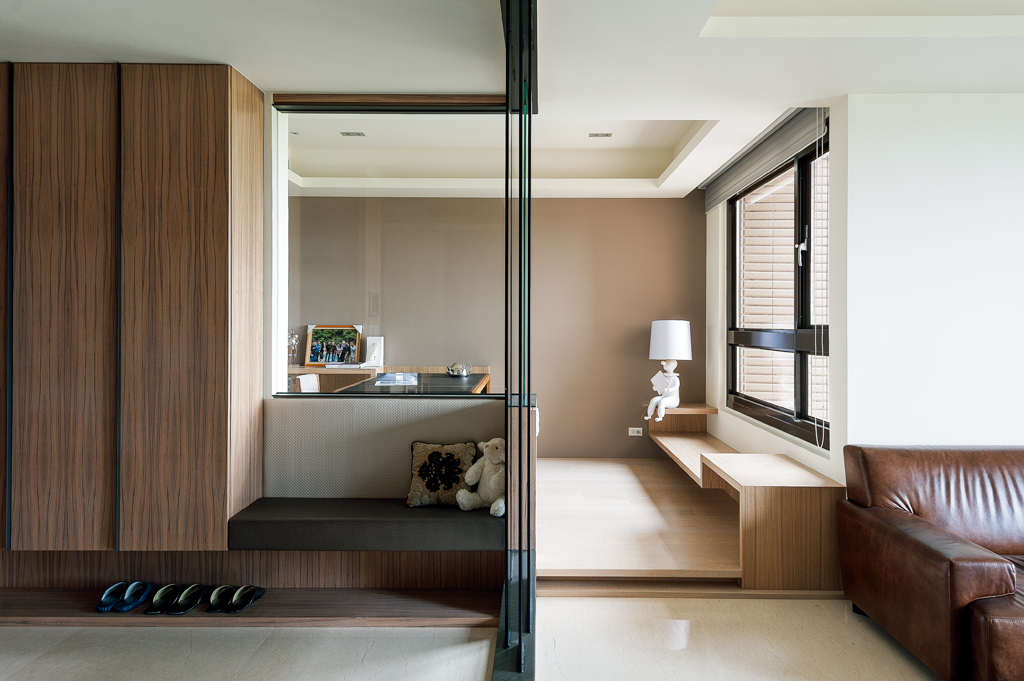 書房清玻璃隔間增加穿透與輕盈感,而玄關穿鞋椅設計則展現機能與美的結合。