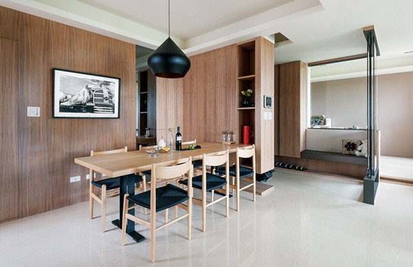 餐廳為全室視覺溫度最高的主牆,藉由垂直的木紋線條來增加空間自然美感。