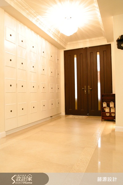 玄關入口的櫃體以線板裝飾,地坪也以石材和磁磚區分,讓玄關的空間感更加立體。