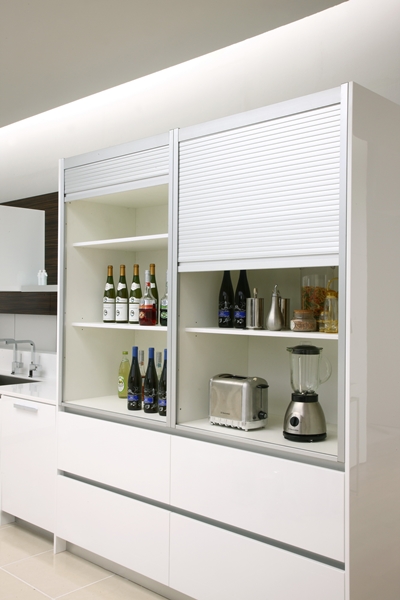 捲門櫃是設計置放在檯面上,利用捲門輕巧的開啟方式,用以收納及取用小型家電及一般廚房器具,是收納空間的一大巧思