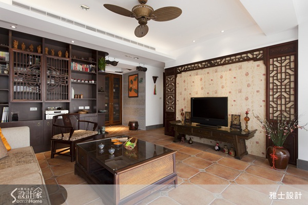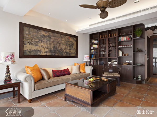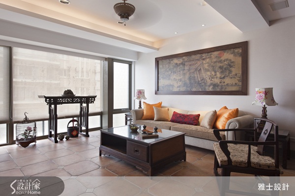 本案是屬於中古屋翻修的案子,屋主鍾情於中式的居家風格,因此設計師便以帶有些許現代色彩的東方風做為空間定調,以簡化的方式帶出不一樣的東方元素。玄關處,地板上的復古地磚、抿石子牆面上掛著以鮮橘色為底的創意畫作以及木質鞋櫃上的牡丹花,讓人一進門立刻就可以感受到古色古香的懷舊氣息,客廳的沙發背牆上擺放屋主最喜愛的清明上河圖,設計師特別利用大圖輸出的方式加上雅緻框架,讓畫作更顯質感,電視牆上則以書法字體的壁紙結合帶有濃厚東方風格的門楣和如意門板,搭配屋主收藏帶有中式色彩的家具,營造沉穩而內斂的人文氣息,落地窗前擺放的典雅精緻桌椅和鳥籠,妝點空間展現獨特的中式意境。