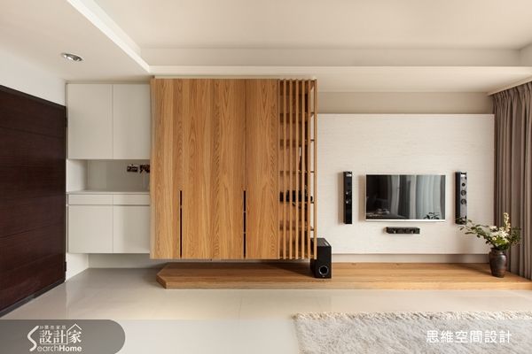 客廳電視牆極簡設計,幾何美學展現,儲物木櫃增添空間溫度。