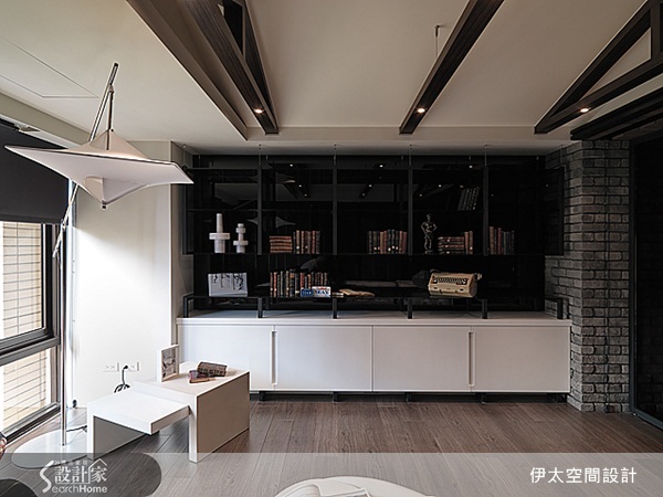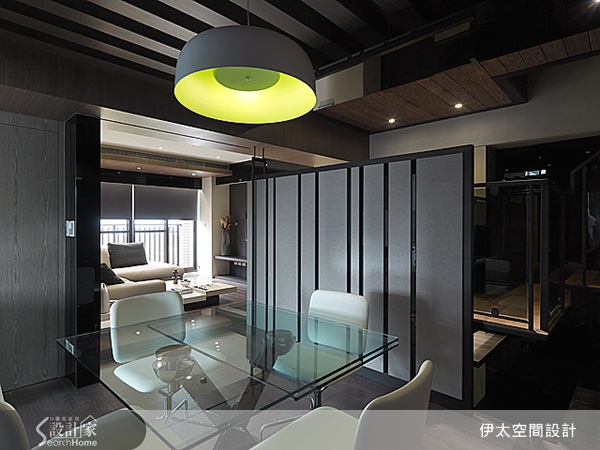本案位於新北市淡水,是樓中樓四房的格局,家中有長輩,夫妻以及一個小孩,80坪的雙層樓中樓讓三代同堂的家庭能夠享有舒適寬敞的起居空間,客廳木地板與牆面、窗簾的灰黑色系,搭配沙發呈現低對比的暗色調,牆面與沙發造型;窗簾的選擇則讓視覺呈現大面積幾何圖形,搭配內嵌式的燈光安排,讓整個空間的視覺刪減到最低限度,視線轉向一旁的餐廳區,選用透明玻璃方型餐桌搭配深色調背景,降低視覺上沉重的感受,簡單的圓形吊燈散發現代主義美學的內涵,刪除一切多餘裝飾,力求簡單實用。