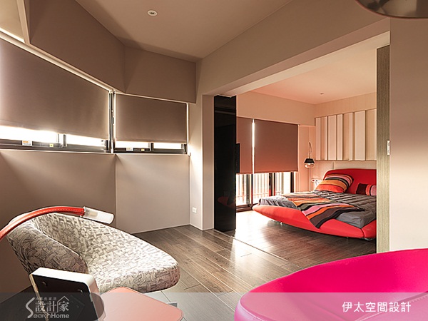 主臥室大膽繽紛,造型椅與床鋪床單的選擇,讓室內空間充滿趣味。