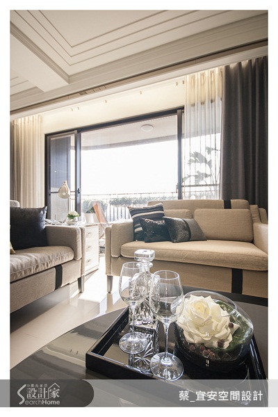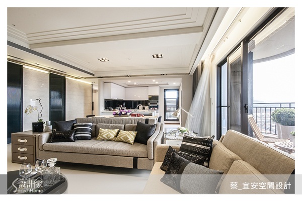 這間位在中和的住宅案,擁有得天獨厚的優勢,不但空間坪數寬敞,置高的樓層位置,提供了一個眺望遠景的絕佳條件,設計師善用空間優勢,規劃開放式公共空間,使得整體互相串連,開闊感由內向外延伸,並在空間採用米白色系為主色調,輕巧的以灰黑色勾勒輪廓,使空間量感輕盈優雅,卻不失個性品味。通往臥室的廊道刻意利用不同的地板材質做為公私領域的劃分,而為了在主臥規劃更衣室,而必須縮減客廳的深度,因此電視牆特別以湛藍色調呈現,使人轉移輕薄素材的注意。陽台為室內注入滿滿的暖意,同時提升了整體居家採光,與整體色調相呼應,空間明亮且舒適並具有療癒感,微風輕拂時,在植栽綠意打造的陽台上放空休憩,享受空間帶來的美好幸福。