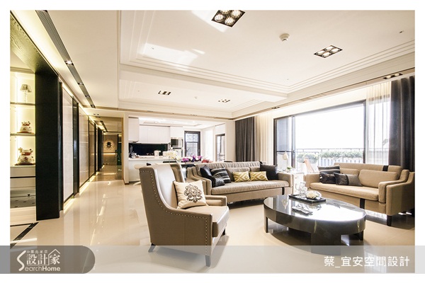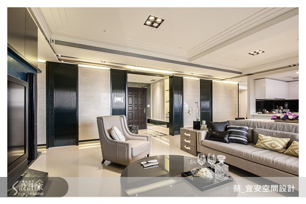 - 主要建材:栓木自然拼、橡木鋼刷直紋、系統櫃、冷烤漆、玻璃/鏡面、咖啡絨大理石、紫羅蘭大理石、馬來漆、鍍鈦板