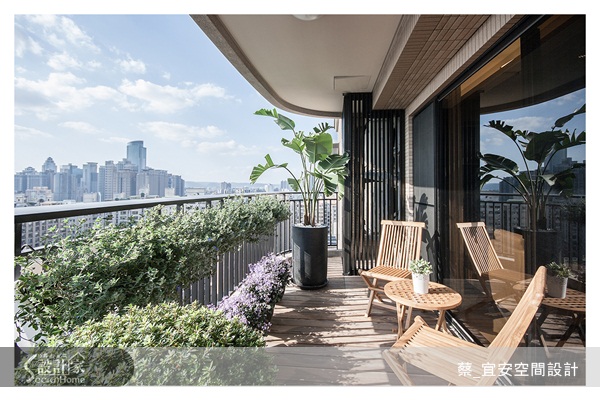 能夠在擁擠的都市居家空間裡,有一方屬於自己和戶外接觸的天地,真的是生活中的小確幸;下班後端杯紅酒坐在陽台看看夜景,或者假日那兒也不去,泡杯咖啡,拿本好書,躺在陽台躺椅上消磨一整個下午,度過愜意的好時光。位在中和的住宅就有一個令人羡慕的大陽台,一望無際的景色加上設計師的規畫,讓裡外寬擴感相連,這樣的空間讓待在家就是一種享受。