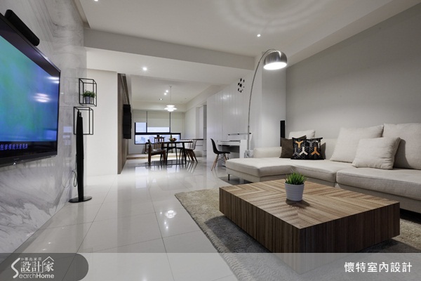 客廳的部分,則是以雪白銀狐大理石為主要的牆面材質,此處沒有多餘的裝修,僅以石材本身的自然紋理來展現出質感與氣勢。在本案中,設計師利用簡單的線條修飾空間中多餘的結構,並且以優雅的深淺對比突出空間個性。在此,透過設計師的巧思與規劃,讓居家空間不僅機能滿分,也展現出現代風格俐落而舒適的特質。