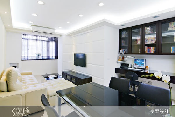 利用白色放大空間的特性,放大狹長客廳的視覺感,加上電視牆的線條設計,讓白色空間不會過於單調。