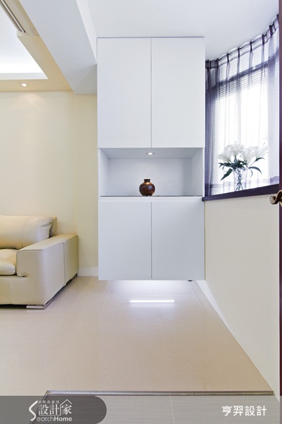 玄關處特別規劃收納鞋櫃,不僅滿足收納需求,中間的的展示櫃設計,則成為入口端景,下方燈光營造輕盈量感。