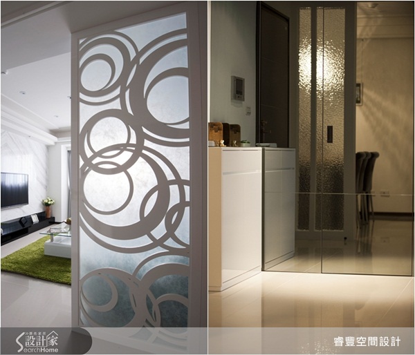 設計師在玄關處利用灰鏡的反射特色,讓空間有放大的效果,也巧妙用雕花屏風化解了「穿堂煞」,是不是既美麗又聰明的設計呢!