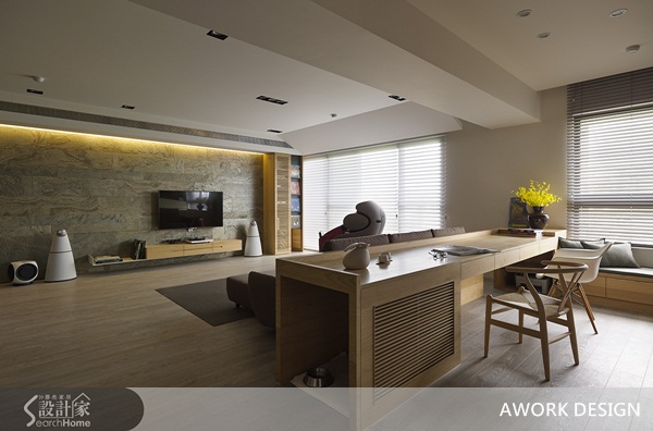 自然粗曠的天然石材所拼貼而成的電視牆搭配溫潤橡木地板,大面落地窗引入大量自然光,營造舒適放鬆的居家氛圍。
