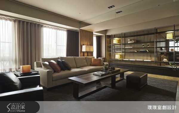 大面落地窗為客廳帶來明亮光線,一旁開放型展示櫃點綴著燈飾,整體流露出祥和的人文氣息。
