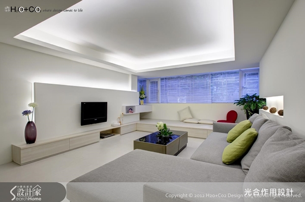 以白色為主色調,搭配淺白橡木紋與灰色沙發,展現溫暖放鬆的空間氛圍,在窗戶旁規劃臥舖設計,提供了一個休憩的小角落。
