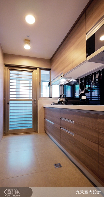採光與通風,在廚房區域佔很重要的角色,設計師以一字型為設計,搭配木色廚具,呈現自然樸實的質感,由於後方就是陽台,空氣流暢光線充足,讓廚房變得明亮。