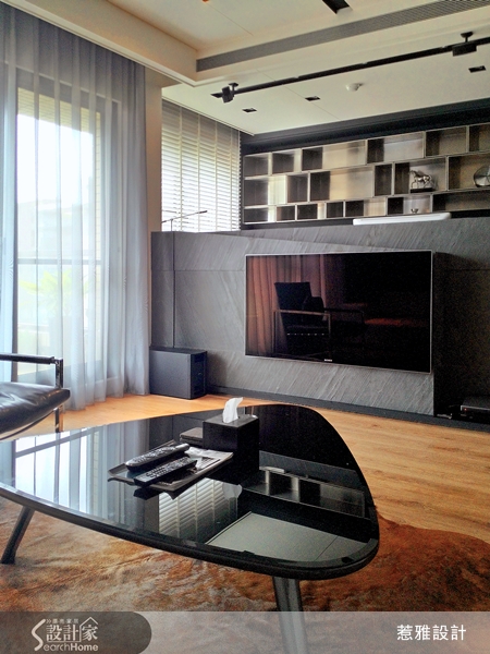 造型電視牆為客廳視覺重點,搭配牆面凹槽,天花板線條裝飾、內嵌燈具,呈現出現代風的簡潔俐落,為了平衡過度冷調、理性的空間氣氛,加入木質地板,造型地毯、皮革等元素混搭,同時也因此增添了些時尚感。臥房的設計一樣以極簡主義為主,運用最少的素材,刪去過多的裝飾,使用線條與幾何造型,營造簡約舒適的休眠空間。