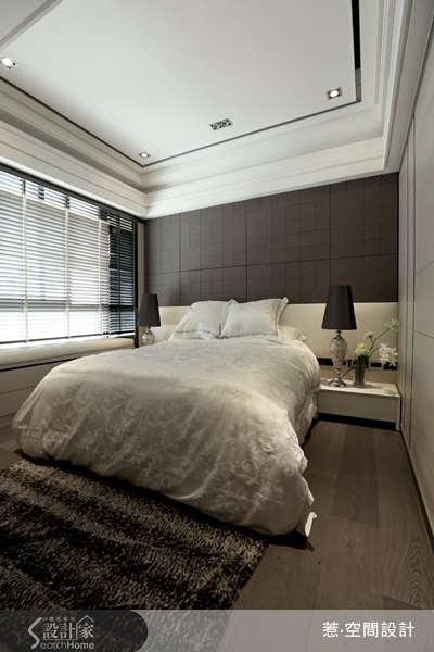 06 看似素面的床板牆,格狀切割方式樣貌符合時尚又不失沉穩大氣,與同是幾何線條的木地板、踏腳毯相呼應,設計上豐富精緻卻不能複雜。