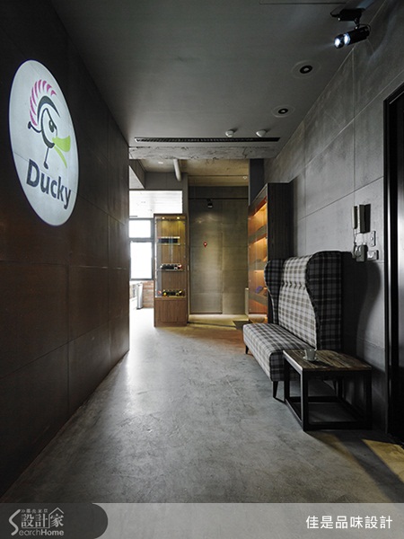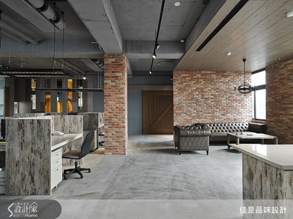 進門的玄關處,以水泥牆搭配公司顯眼的 LOGO,充分展現出低調簡約的個性;輔以仿古沙發的雅致,流露出深度的內涵
