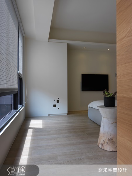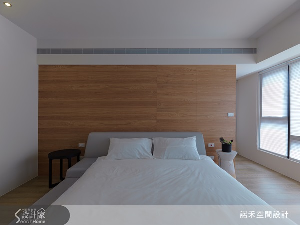 以白色為主色調、木質床頭背牆、戶外透入的自然光,呈現明亮清爽的無印風格。