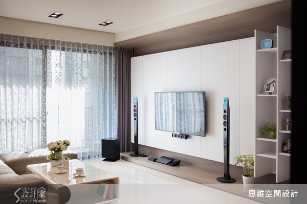 客廳採光極佳,溫暖直達脾肺,縱有任何憂煩也能一掃而盡;流線型與宛如鋼琴黑白鍵般的機能型置物櫃都呼應了「音樂」這個設計主題。明亮的空間、開朗的氣息,入夜後,更能在客廳旁的小吧台上靜靜品上一杯美酒的醇。高掛的酒櫃讓屋主得以陳列收藏,同時也活絡了視覺。