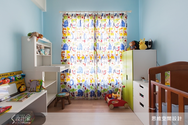 兒童房明亮、繽紛,利用藍綠色調的交融勾織出天與地的心胸。收納桌櫃多能讓家長跟小朋友一目瞭然裡面藏了甚麼「好物」,減少翻找物品的時間