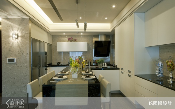 IS設計以吧台結合中島的設計替代餐桌並維持了廚房的空間感,捨棄複雜的線條,僅以溝縫來架構空間,簡潔又細膩的手法,展現空間的大器,擅用大理石的 IS設計以不同石材混搭提升空間質感,並適當融入屋主的字畫及古董蒐藏,讓 38坪的一般住宅也能擁有如豪宅般的大器及質感。