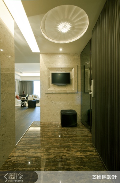 玄關代表著門面,IS設計除了賦予玄關該具備的收納機能外,並運用大理石地板及圓形造形天花板去營造出空間氣勢。
