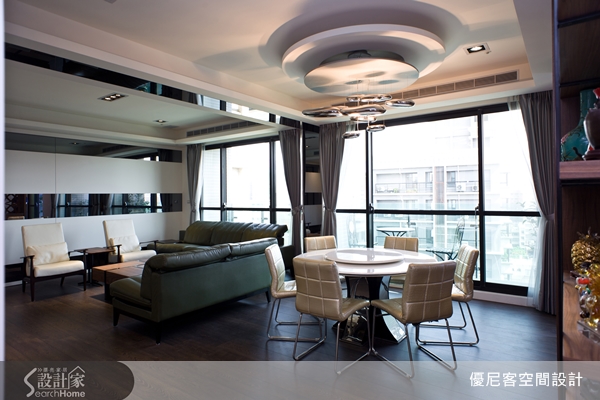 細心在客廳牆面使用鏡面素材,讓白色牆面增添趣味的視覺感,延伸空間的廣闊感。餐廳上方是多圓結構的造型天花板,創造出空間的無限可能性。主臥空間,以柔黃燈光,讓人舒緩身心;女兒房與男孩房,則以色系與配件做為區隔。多種技法,突顯出現代風在裝潢上的無限可能。