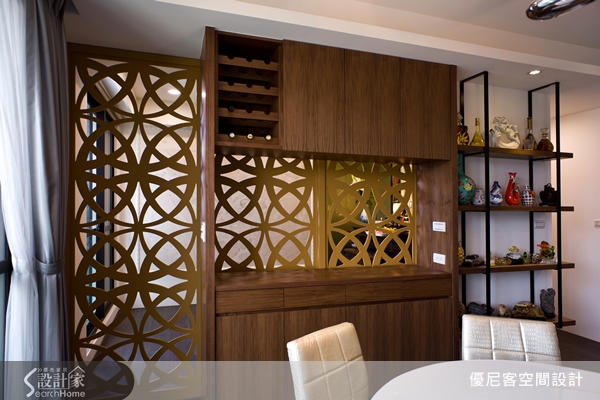 細膩且別具韻味的鏤空式屏風,是幾何造型混搭的高超技巧,搭配上設計風餐桌椅與型天花板,不僅相互呼應,更展現出多層次且具一體感的空間趣味。