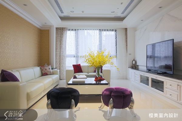 簡單舒適的空間,以古典風為設計,空間簡單明亮,餐廳與客廳無隔間的格局,讓主要的客餐廳區公共空間有更寬敞的感受,在簡單的格局下,運用壁紙紋樣、家具樣式與擺飾營造出優雅的古典氣息。客廳的落地窗搭配窗簾,採光明亮柔和,電視牆的壁面特殊紋樣,也提升空間中的藝術感,選用的單椅、造型電話、窗簾花紋,均增添了空間中的風格性。米白沙發組運用暗紅抱枕搭配,更顯高貴。轉向一旁來到餐廳區,圓形餐桌、華麗的水晶吊燈,波紋造型的餐椅,加深了古典風的印象,坐上餐桌,想像自己回到文藝復興時期,心情也跟著優雅起來。