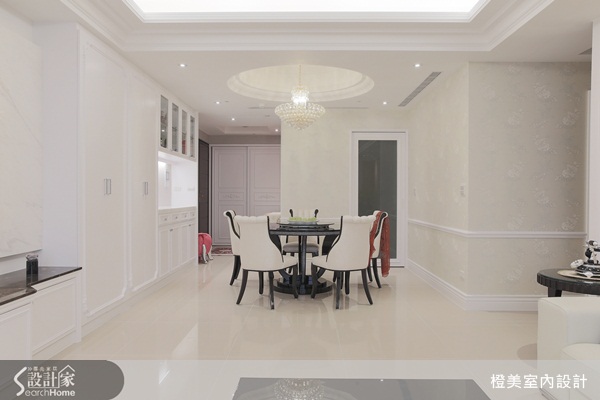 客廳的另一端為餐廳區,無隔間的動線設計讓空間感更加寬敞,華美的水晶吊燈、圓形餐桌、波浪紋樣裝飾的復古餐椅,均是古典風的重要元素。