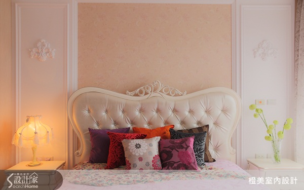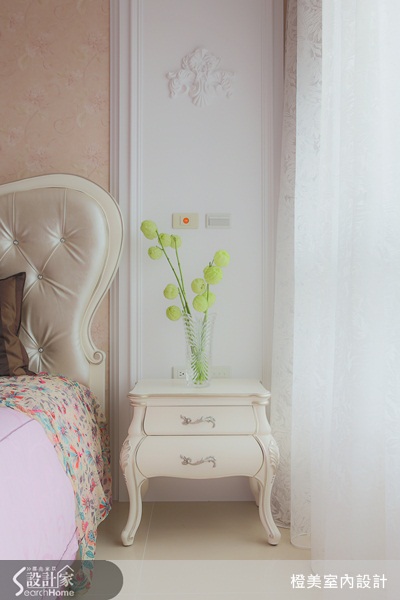 床頭邊桌也選用古典風造型,仍然是以圓弧造型加上波紋裝飾,上方的壁飾也是古典風重要元素之一。
