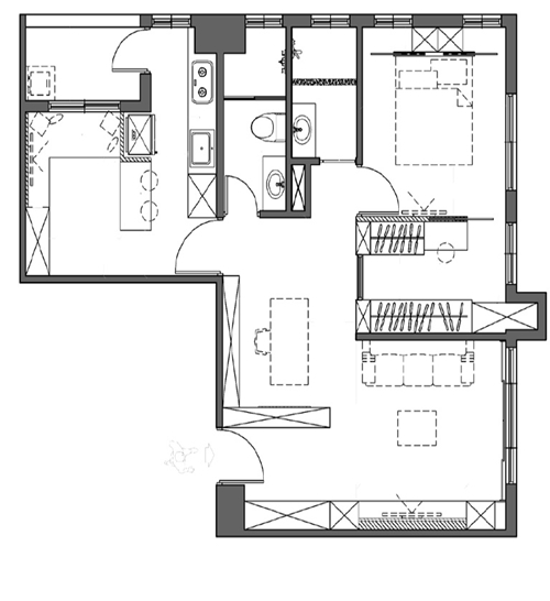 空間適度被打開了之後,空間呈現開放形式,為了讓相異的環境能相互融合,在廚房與起居室之間加入了中島吧台,無論是在吧台區還是臥榻區,使用者都能以最舒適姿態享受其中。