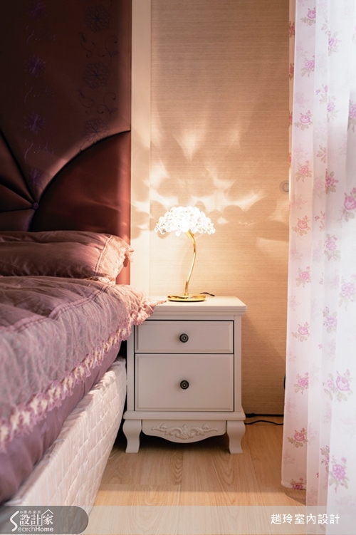 為了體現主人特質,臥室以紫色調來做鋪陳,同時還搭配造型床頭版,以及小碎花窗簾,相互映襯之下,整體不只充滿浪漫情境,還把女性柔情特質給展現了出來。