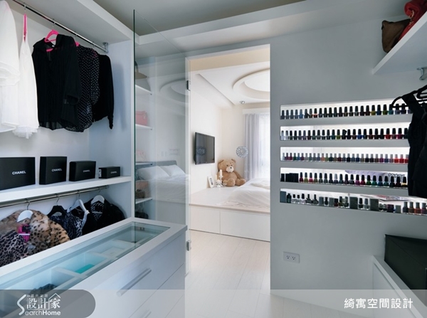 女主人收藏了三、四百瓶指甲油,設計師事先了解各式瓶身設計與尺寸,在主臥化妝檯和更衣室之間,設計了指甲油展示櫃,玻璃材質讓臥房光線穿透櫃體進入更衣室,完成既耀眼又實用的隔間櫃設計。