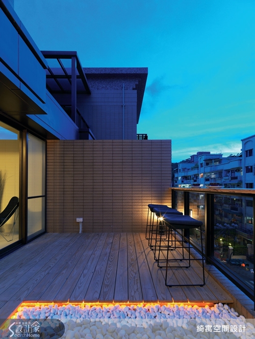 住在擁擠的都市中,不免渴望一個可以自由呼吸、親近自然的角落。設計師利用建築原有條件延伸,以南方松地板、鵝卵石及高腳椅,創造出能愜意欣賞晨昏美景的浪漫露台。