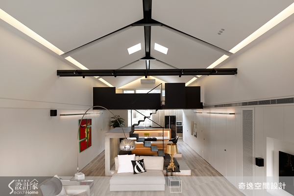 保留獨特的斜屋頂造型,納入別富設計感的風格樓梯,讓偌大的空間有了視覺重點,感受設計師帶來的無限驚喜。