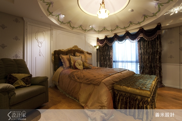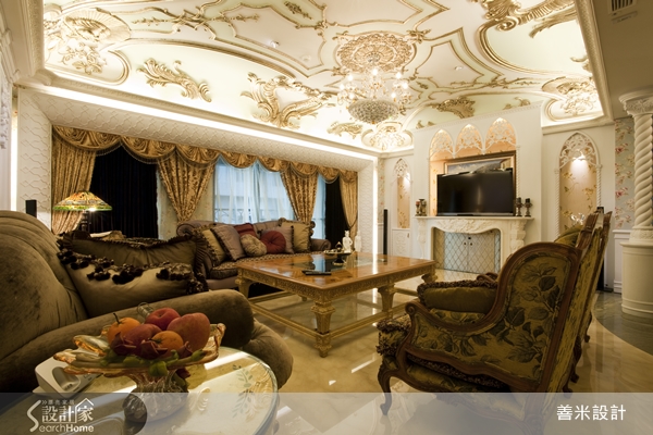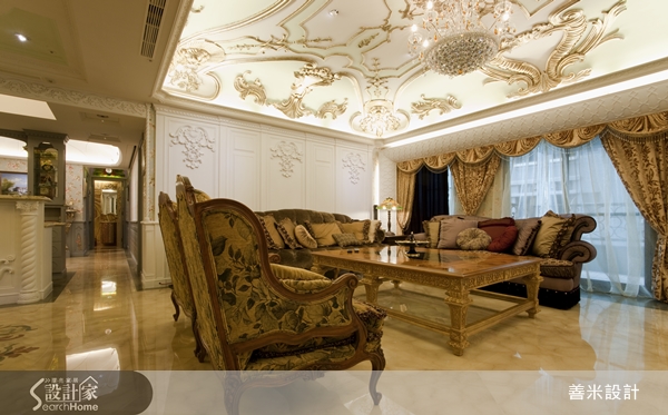 屋主偏好華麗的宮廷風格,設計師配合屋主的喜好,將60坪、4房2廳的寬闊空間,量身訂作,打造了一個帶有法國凡爾賽宮廷風的華麗居家。一進門的入口處,設計了一橢圓形的玄關邊界,天井式橢圓屋頂與金色花紋的天花板雕飾,搭配彩色水晶燈,一進門就有祥和且富麗堂皇的貴族氣息。兩側弧形立體收納腰櫃,流暢地包覆.搭配白色扭絞麻花狀的實木雕刻立柱,似如雙臂環抱玄關.再與圓形的花式地板相呼應.隱喻圓融聚氣的吉祥寓意。