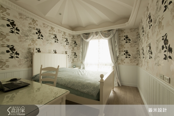 主臥室天花板的同心圓設計,散狀輻射如傘骨般立體的細緻折線,傘狀的邊緣滾上一圈手工彩繪圖案,如同童話故事中的旋轉木馬,向上仰視,像童話一般的美好。